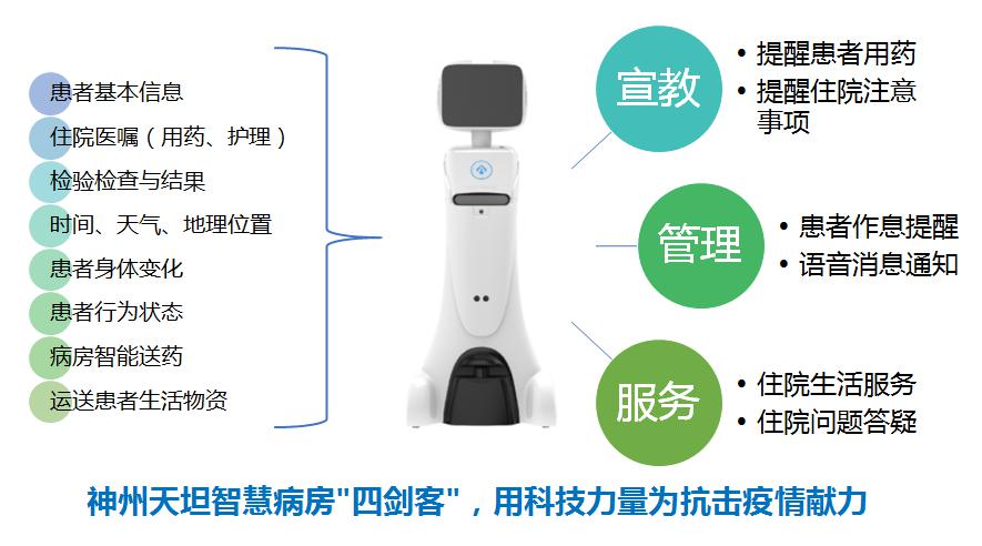神州天坦智慧病房"四劍客",是神舟天坦憑借著十余年在醫(yī)療衛(wèi)生領(lǐng)域中豐富的行業(yè)經(jīng)驗(yàn)積累,并針對(duì)此次新冠疫情防治的一線醫(yī)護(hù)人員日常工作需求,優(yōu)選出的可以快速搭建、臨床實(shí)用性高的智慧病房四大子系統(tǒng),具有很強(qiáng)的建設(shè)價(jià)值。以軟硬件、物聯(lián)網(wǎng)和人工智能技術(shù),構(gòu)筑起防治新型冠狀病毒的信息化關(guān)口,為醫(yī)護(hù)人員診療工作、患者住院服務(wù)進(jìn)行保駕護(hù)航。以科技的力量為抗擊疫情獻(xiàn)力,我們一起攜手同行、共克時(shí)艱。贏得這場(chǎng)沒(méi)有硝煙的戰(zhàn)“疫”,中國(guó)加油!戰(zhàn)“疫”必勝!