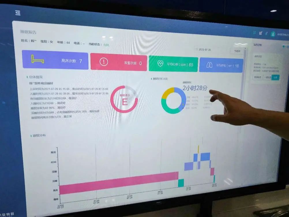除了輸液外,患者的生命體征和運(yùn)動軌跡也是醫(yī)護(hù)人員需要時刻操心的問題。智慧病房搭建智能在床實(shí)時監(jiān)測系統(tǒng),在床墊下放置了傳感器,可以精準(zhǔn)測量和傳輸患者的生命體征、睡眠、離床等數(shù)據(jù),一旦數(shù)據(jù)異?;蛘呋颊唛L時間不在監(jiān)測范圍內(nèi),系統(tǒng)會自動進(jìn)行異?;螂x床、跌落等警報(bào),可以及時避免意外事件發(fā)生。