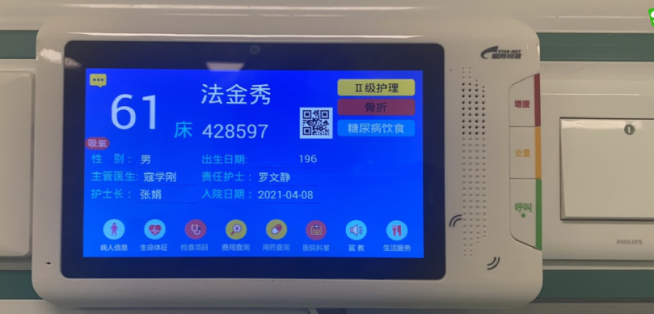 入住科室的第一天,護(hù)士會(huì)對(duì)患者進(jìn)行“入院宣教”,除了正常的住院注意事項(xiàng)外,還專門指導(dǎo)患者學(xué)會(huì)了病床上方患者端的“ 智能電子床頭屏”,它是患者住院期間的信息小助手,通過它不僅可以查詢患者的體征數(shù)據(jù)、護(hù)理事項(xiàng)、住院費(fèi)用、檢查項(xiàng)目預(yù)約情況、住院及治療須知等豐富信息,還可以提供點(diǎn)餐、醫(yī)療服務(wù)評(píng)價(jià)等服務(wù)。